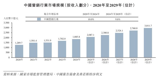 在政策激励、企业对品牌设立及数字化转型需求不断增长以及消费者对文化契合度、情感共鸣及性价比的预期不断变化的情况下,中国营销行业持续增长并预期维持其增长趋势。