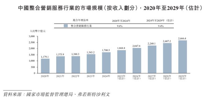 中国整合营销服务的发展主要由三个相互关联的因素驱动。首先,持续的消费升级和企业品牌需求的提升正在推动营销投资增加。其次,AI、大数据、短视频平台及电子商务直播等数字技术的深度渗透及持续创新,使营销模式更高效、更有针对性及可扩展性。第三,对集成端到端解决方案的需求不断增长,提供整个旅程的无缝消费者体验。