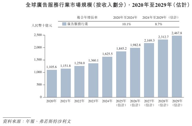 于2022年度、2023年度、2024年度、2025年截至9月30日止九个月,公司实现收入分别约为366.83亿元(人民币,下同)、526.16亿元、607.97亿元、518.01亿元。于往绩记录期间,公司的收入主要来自提供出海跨境营销服务,境内整合营销服务及境内全案广告服务。