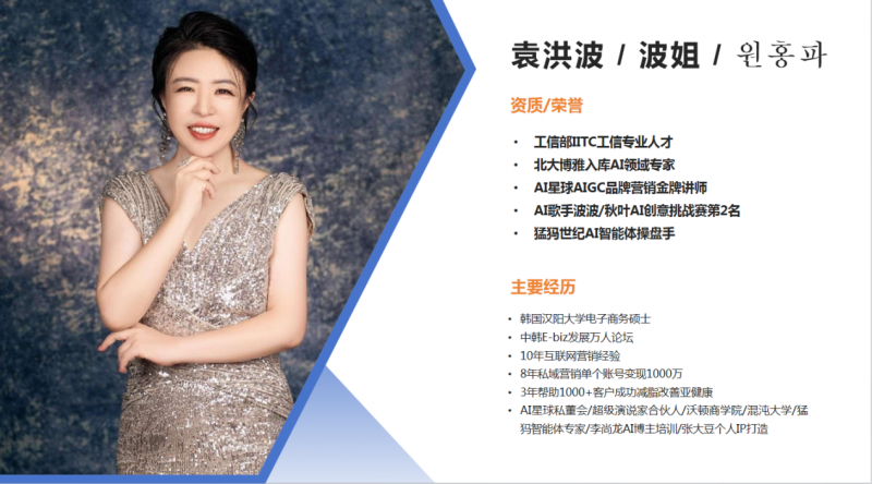 作为北京盈响丽文化传媒有限公司创始人、AI星球核心讲师,袁洪波的人生下半场,因AI技术迎来全新蜕变。2024年,老师用AI创作的歌曲《最高版本的自己》让她深受震撼,这份触动让她意识到技术对梦想的承载力量。她随即以AI为工具,打造出个人微电影《2027AI》,推出专属个人IP“AI歌手波波”,用“没有烦恼,只有节奏,跟我一起跳动,让快乐上头”的歌词,将潜藏多年的音乐热爱转化为可被世界看见的作品。50岁的她,在营养学、心理学与演讲的积累之上,借AI激活了人生新可能,完美诠释了“当工具遇见热爱,梦想就有了回家的路”。