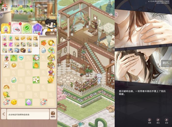 从具体游戏体验来看,《花与绯想》和市面主流二合产品如《浪漫餐厅》相似,主要分为二合、建造与解锁剧情。玩家消耗体力将物品两两合一,通过完成相关订单获得金币。所获金币则用于修缮家园,添置各种家具及装饰。通过建造,玩家能获得道具解锁剧情。
