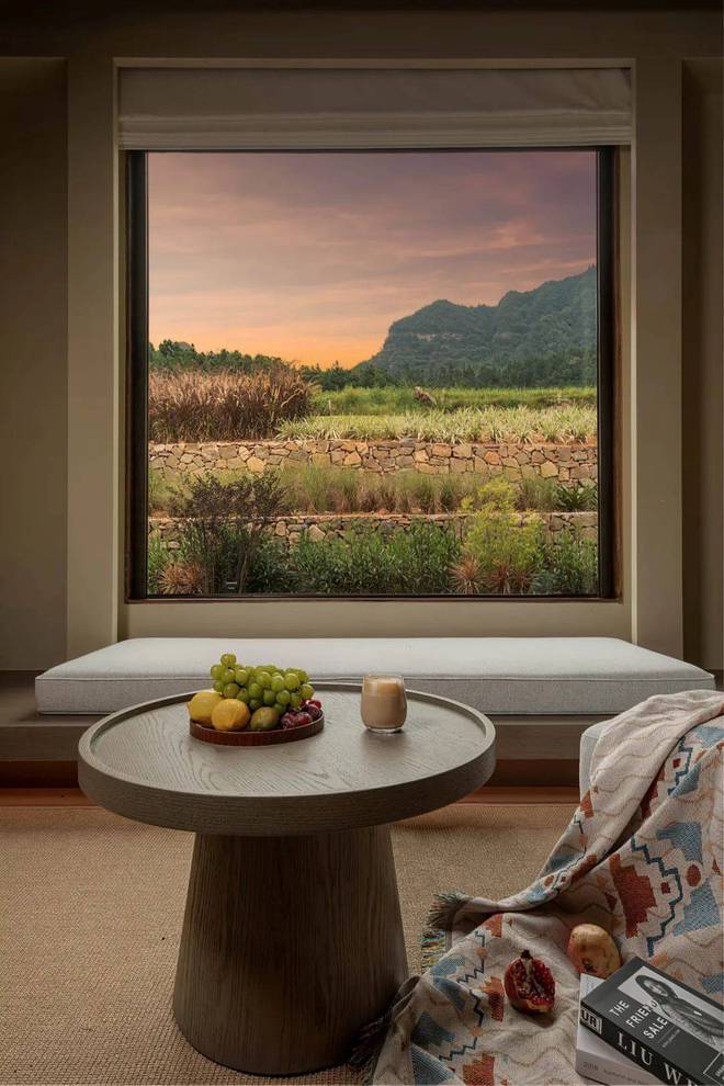 AD国际建筑设计了荷畔、林隐、栖梦等30间主题景观客房,将户外景观最大化纳入室内,人们透过窗棂可以饱览奇峰秀水层叠梯田,耳边则是远处传来的虫鸣蛙唱。
