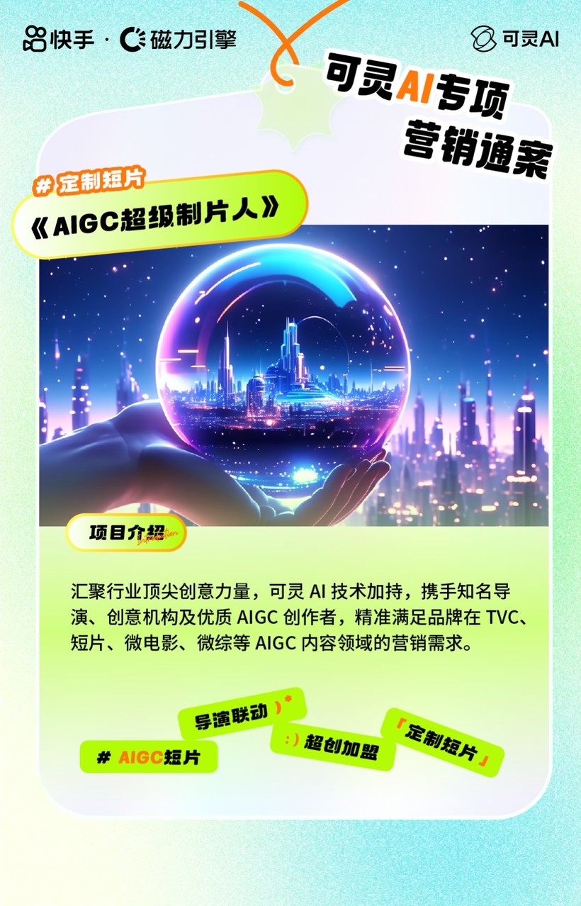 定制短片短剧。为了满足品牌在TVC、短片、微电影、微综、剧情等AIGC内容领域的营销需求,《AIGC超级制片人》则携手AI导演、创意机构及优质AIGC创作者,打造品牌AIGC专属视听创意内容。在输出高品质AIGC短片的同时,集结UGC互动玩法与快手站内外资源,推动内容破圈和长尾传播。