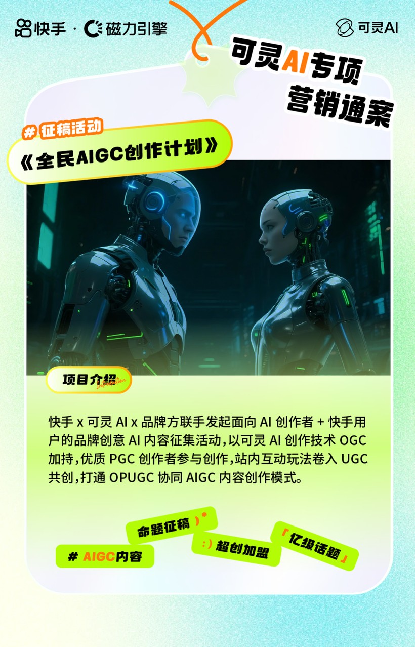 UGC内容挑战赛。作为快手、可灵AI、品牌方联手发起,面向AI创作者+快手用户的品牌创意AI内容征集活动,《全民AIGC创作计划》打通了OGC、PGC、UGC联动的AIGC内容创作模式。通过打造1场全民AI共创互动、N支品牌AI大片、X个品牌高热话题,立体化输出品牌AIGC视听创意内容,以亿级话题流量,助力品牌AI营销破圈。
