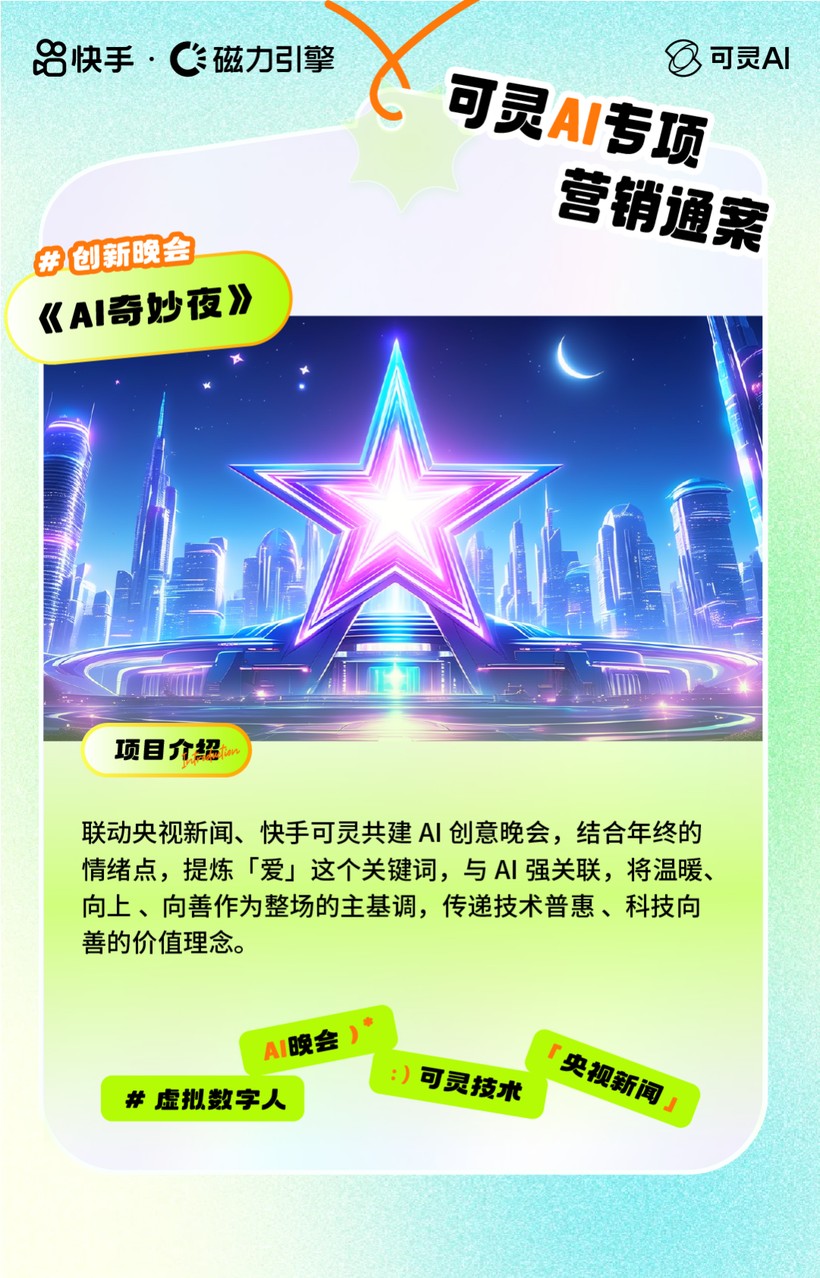 AI创新晚会。AI技术与视听艺术的突破性结合,为综艺晚会的内容创作和创意效果注入创新活力,也为品牌营销创造了全新场景。2024年岁末,央视新闻联动「可灵AI」打造AI创意晚会《AI奇妙夜》,为观众带来集文艺创作和科技探索于一体的AIGC创新体验,双方通过联合形成传播矩阵,共创现象级大事件。