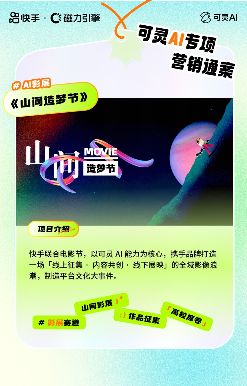 AI新影像看片会。伴随AIGC创作浪潮,「可灵AI」联动影展资源推出《山间造梦节》,携手品牌打造“线上征集、内容共创、线下展映”的全域影像潮流,百大高校参与其中,推动内容破圈与社会议题的跨界共振。