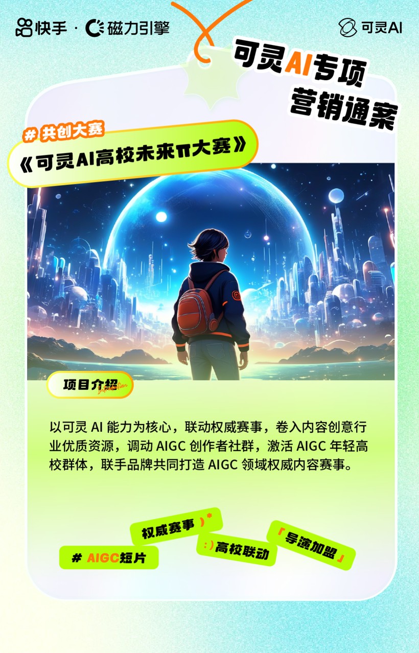 共建创作大赛。「可灵AI」以自身能力为核心,携手品牌打造“可灵AI高校未来π大赛”,联动世界级权威创意大奖,邀请导演、媒体人等行业专家加盟,激活高校年轻用户的AI创作活力,联合品牌共同打造AIGC领域权威内容赛事。