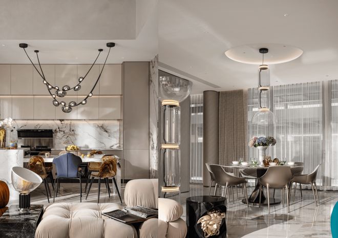 光以一种温柔的姿态,轻轻透过落地窗,洒满这方温暖的居室,为空间披上一层金色的纱幔。金属与皮革的碰撞散发时尚的优雅,延伸出古典与现代的微妙关系,创造出一种层次丰富、格调独特的居住体验。夜幕低垂,开阔的景观视野成为一幅流动的画卷,将繁华都市的无限魅力尽收眼底。