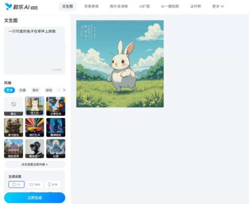 步骤1:浏览器访问移乐AI官网,点击“文生图”。进入功能页面后,在提示词一栏中,写下描述性文字,比如“一只可爱的兔子在草坪上奔跑”。