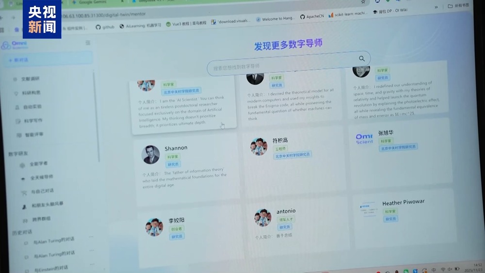 该系统构建了一套贯穿科研全流程的智能支撑体系,已深度融入从文献调研、创意构思、实验设计到论文撰写的科研全流程,系统构建了从全球知名科学家到教师、科研人员的数字孪生智能体,可以陪伴青年科技工作者共同参与科研,给出启发和建议,并与学生共同成长。