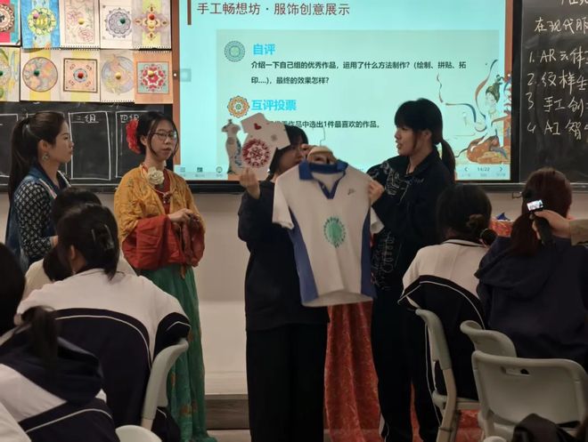 何丽丹老师、魏梦琪老师团队的课程以服装设计为载体,紧扣 “传统活化” 核心,让学生在手工拼贴龙纹、宝相花等传统纹样的基础上,借助豆包 AI、AR 云展等工具实现创意升级。课堂上,李同学、张同学等一众学子遵循 “简化提炼、功能适配、审美契合” 三法则,将复杂纹样去繁就简,结合现代流行色转化为服饰局部图案。通过 AR 云展线上线下同步展示作品,AI 智能点评精准指出色彩、构图优化方向,同学们既掌握了 AI 生成、优化纹样的实操流程,又在创作中深化了对中华优秀传统文化的认同,实现了 “手工温度 + 科技效率 + 文化传承” 的三重突破。该课程也成为深圳中职美育与科技融合教学的优秀范例。