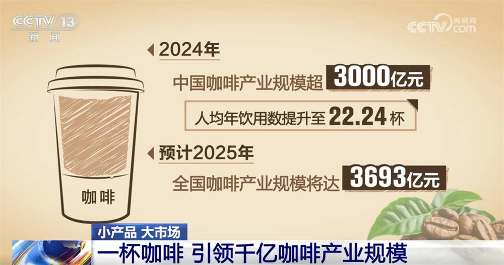 相关数据显示,2024年中国咖啡产业规模超3000亿元,人均年饮用数提升至22.24杯,预计2025年全国咖啡产业规模将达3693亿元。小小一杯咖啡,映照出中国大市场的蓬勃活力和广阔空间。