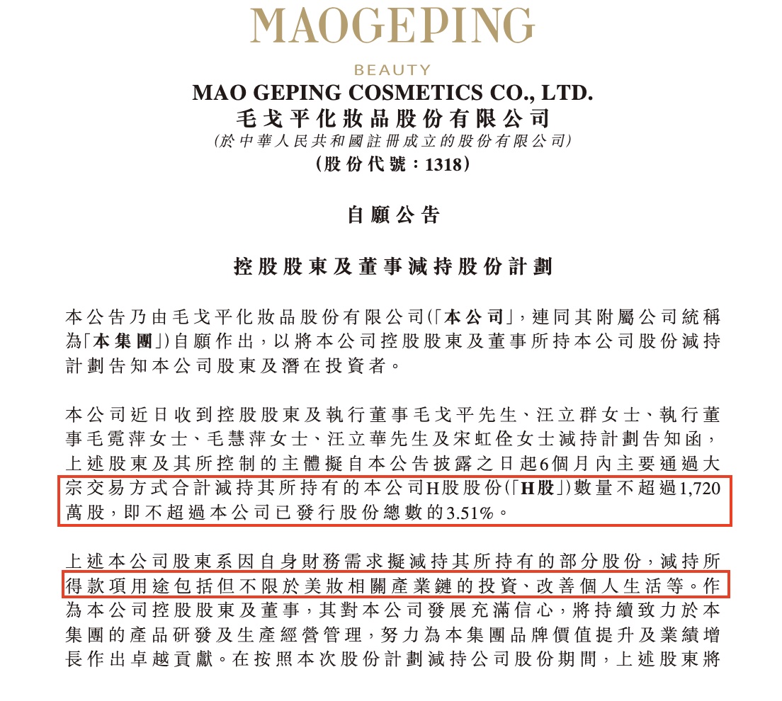 近日,登陆港股市场刚满一年的毛戈平化妆品股份有限公司发布了一则引发市场关注的公告:公司控股股东毛戈平、其配偶汪立群,以及毛戈平的两位姐姐毛霓萍、毛慧萍,汪立群的弟弟汪立华,加上核心高管宋虹佺,共计6人计划在未来6个月内减持不超过1720万股H股,占公司已发行股份总数的3.51%。