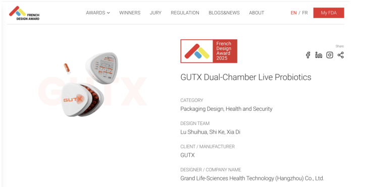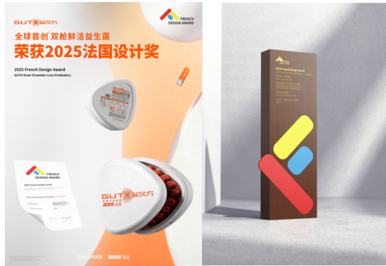 此次奖项评选,远大生命科学集团旗下思连康®️出品的专业益生菌品牌-GUTX益次方,凭借其全球首创*的“双舱鲜活益生菌”包装设计,成功摘得2025年法国设计奖。这不仅标志着GUTX益次方的包装创新获得全球设计界的权威认可,更使其成为中国首个益生菌品类包装领域荣获该奖项的品牌,为中国大健康产业的工业设计留下浓墨重彩的一笔。这不仅是一次荣誉,更是远大工业设计的灯塔和标杆!